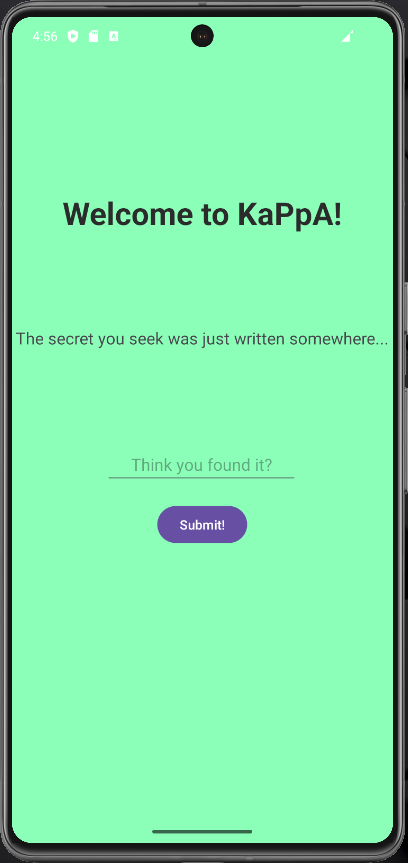 Then recompile and reinstall and run the app. The password is printed in logcat. Typing the password into the text input in the app will cause an alert to appear with the flag.